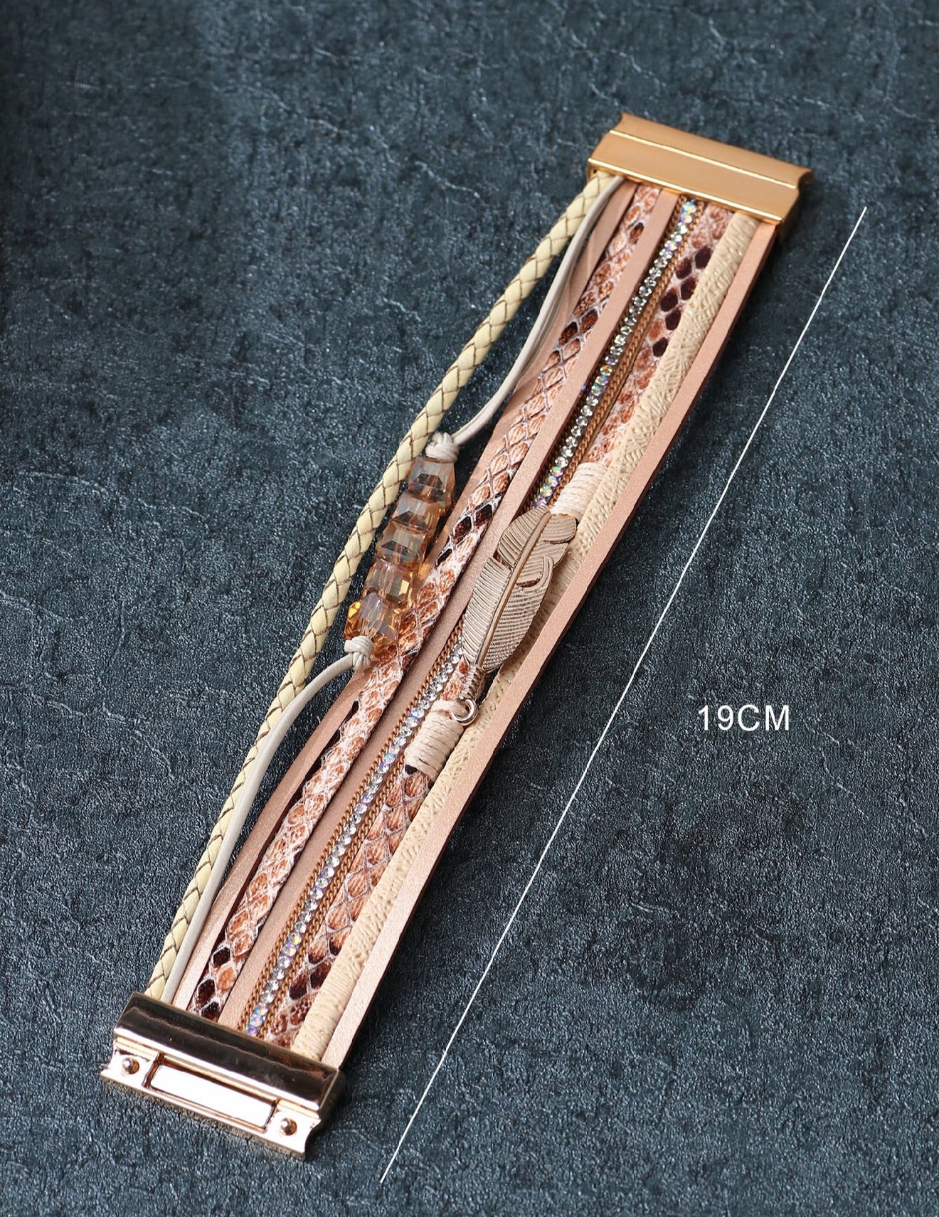 Melida en tonos marrones, ámbar y dorados, esta pulsera evoca la calidez de la tierra. Un encantador dije de hoja en el centro, simbolizando la belleza y la renovación. Una joya perfecta para los amantes de la naturaleza.